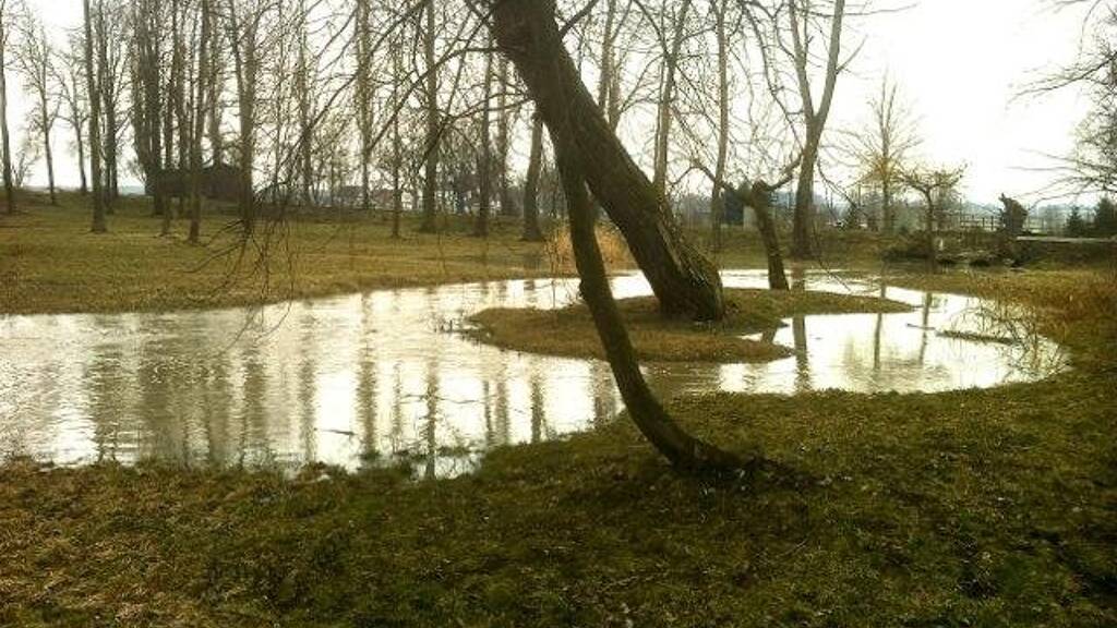 Surrounded by a stream, the stream of the village, a river and fields, woods and meadows.