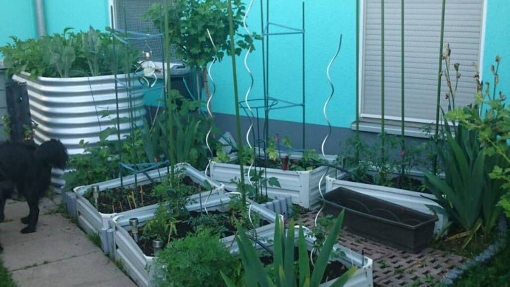 Eine Glastür führt hinaus auf den gemütlichen Sitzplatz auf der überdachten Terrasse. Eine kleine Treppe bringt Sie hinab in den kleine Garten, wo die Eigentümer ihr eigenes Gemüse und Küchenkräuter anbauen, aber auch Beete mit Sträuchern und Stauden liebevoll pflegen.