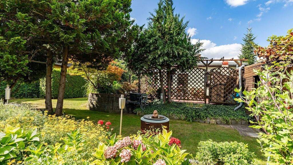 Der Garten ist ansprechend gestaltet und mit 2 Gartengerätehäusern und einem Teich ausgestattet.