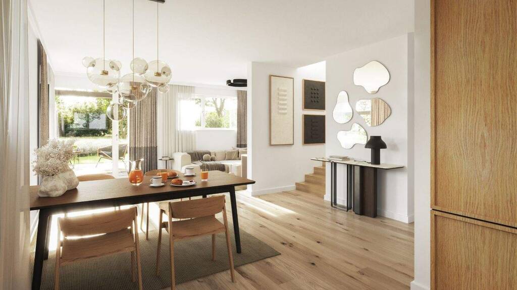 Die einzelnen Haushälften bieten Wohnflächen von ca. 147 m² bis ca. 158 m² und überzeugen durch eine funktionale und zugleich großzügige Raumgestaltung. Im Erdgeschoss bildet der offen gestaltete Wohn-, Ess- und Kochbereich das Herzstück des Hauses. Bodentiefe Fenster sowie elegante Eckverglasungen sorgen für eine helle, freundliche Atmosphäre und ein angenehmes Raumgefühl. Von hier aus gelangen Sie direkt auf die Terrasse mit naturbelassenen Lärchenholz-Dielen, die den Wohnraum harmonisch in den Außenbereich erweitert.