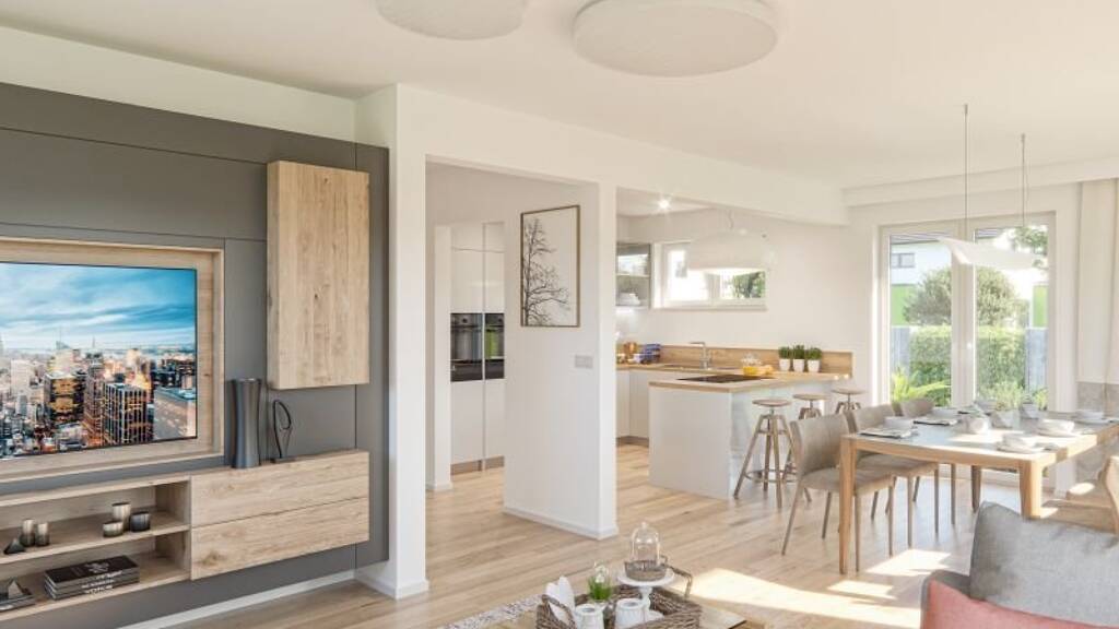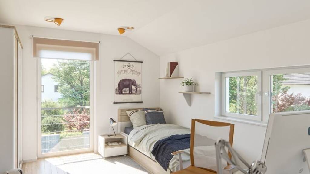 Von außen hat dieses Einfamilienhaus einen eher traditionellen Charakter. Innen beweist es eine sehr moderne Bauform. Kochen und Essen sind eine großzügige Einheit, der Wohnraum mit integrierter Treppe, die in das Dachgeschoss führt, ist separat. Im Dachgeschoss sind zwei gleich große Kinderzimmer integriert, ein Elternschlafzimmer mit Ankleide und ein modernes Bad gehören dazu. Es eignet sich besonders fu?r schmale Grundstu?cke.
