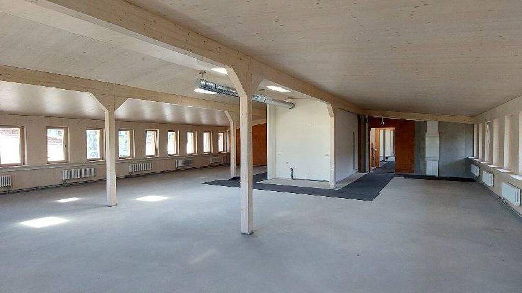 Der derzeitige Ausbau als Großraum lässt sich individuell gestallten und aufteilen. Die vielen Fenster und die zum größten Teil mit Holz errichtete Büroeinheit sorgen für ein sehr angenehmes und helles Ambiente.