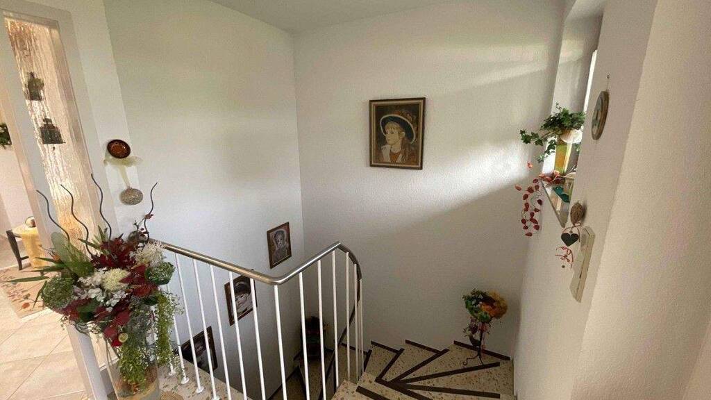 Das Wohnhaus ist im Eingangsbereich so gegliedert, dass man rechter Hand in das Kellergeschoss gelangen kann, linker Hand in ein optionales Büro und geradeaus in den eigenen Wohnbereich. Eine Lichtkuppel im innenliegenden Flurbereich erhellt diesen angenehm mit Tageslicht. Der Flur selbst gliedert sich in eine Art L-Form. Linker Hand abgehend gelangt man zu den vier Kinder- und Schlafräumen sowie zwei Badezimmer. Geradeaus weitergehend lässt sich der Tagesbereich mit blickgeschützten, aber dennoch offenen, Essdielenbereich sowie eine klassische Küche und ein voluminöses Wohnzimmer begehen. Große Fensterflächen und praktische Gliederung innerhalb der Räume ermöglichen diverse Einrichtungsvarianten. Ein Abstellraum und eine separate Gäste-Toilette befinden sich selbstverständlich ebenfalls auf dieser Ebene. Wem diese Wohnfläche noch nicht ausreicht, der kann im Untergeschoss entweder nur ein weiteres großes Zimmer nutzen, oder hat Zugang zu einer Art Einliegerwohnung mit zwei Zimmern, Bad und offenem Schlafbereich. Diese Bereiche im Untergeschoss lassen sich auch gut für eine Bürosituation innerhalb des Hauses nutzen, da sie über großzügig bemessene Wohnraumfenster und außenliegende Palisadenschächte bzw. den Treppenaufgang zur zweiten Terrasse viel Tageslicht in die Räume fallen lassen. Viel Platz bieten, neben der Waschküche, auch die diversen Kellerräume, in denen Sie nicht nur Ihre Gartenutensilien verstauen können, an. Insgesamt verfügen Sie hier über ein Haus, welches das Baujahr nicht verheimlicht, aber durch den pfleglichen Umgang und leichte Modernisierungen sehr gepflegt übergeben werden kann. Überzeugen Sie sich von der angenehmen Atmosphäre des Wohnhauses und seinen großzügigen Räumlichkeiten bei einer Besichtigungen.