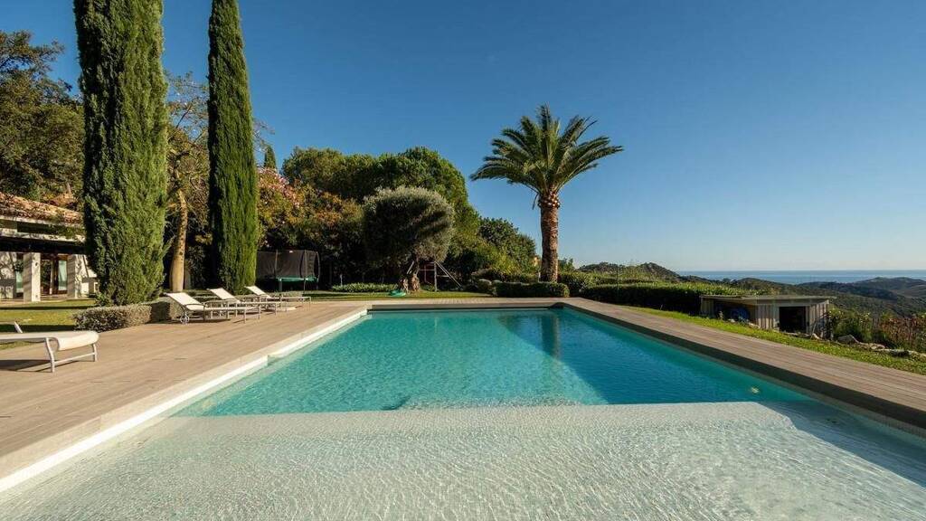 Der große Garten ist mit altem Baumbestand und viel üppigem Rasen dekoriert, perfekt für die Familie, um den Außenbereich zu genießen. Der beheizte Pool, umgeben von einer Holzterrasse und Liegestühlen, ist genau das, was Sie erwarten würden, mit atemberaubendem Blick auf das Meer und die Berge.
