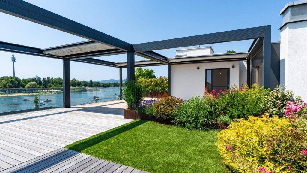 Ein weiteres - wenn nicht DAS - Highlight dieses Schmuckstücks befindet sich am Dach des Hauses: eine über 130 m² große, liebevoll gestaltete Terrasse mit geschmackvoller Begrünung, automatischem Bewässerungssystem, riesiger Pergola und atemberaubendem Blick aufs Wasser - sogar von der Sauna aus. Selbst für ein Jacuzzi wäre noch genügend Platz vorhanden, und bereits alles vorbereitet.