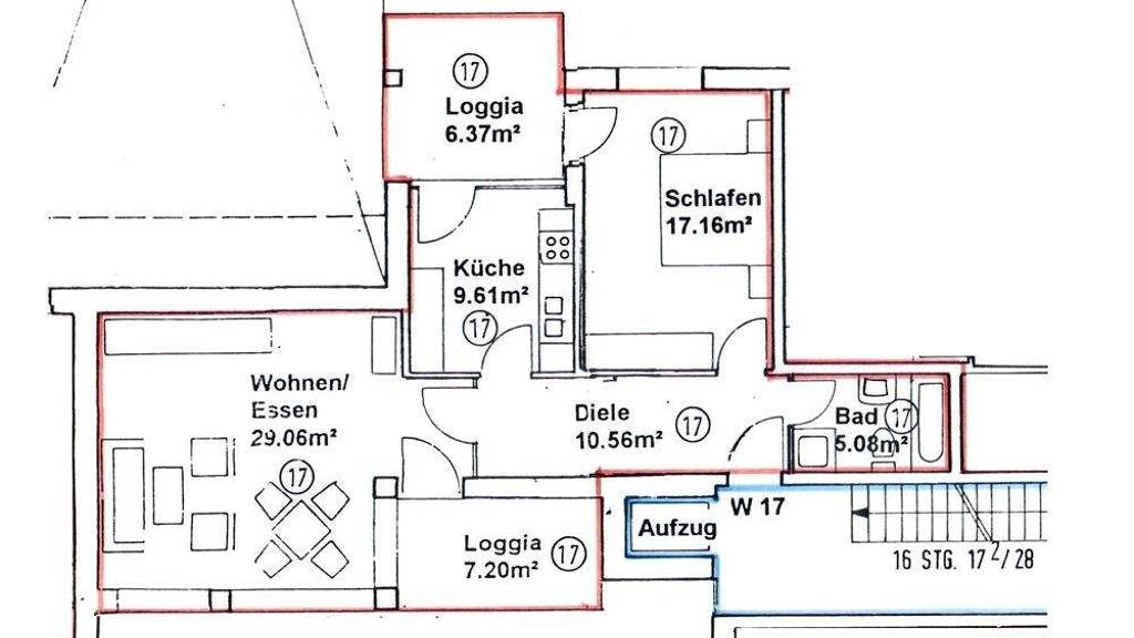 - Wohnzimmer mit Laminat - Schlafzimmer und Küche mit Loggiazugang - überdachter Balkon und Terrasse (Loggia) - Wannen-Dusch-Bad - Kellerraum - PKW-Außenstellplatz - Gemeinschaftswaschkeller - Gemeinschaftsfahrradkeller