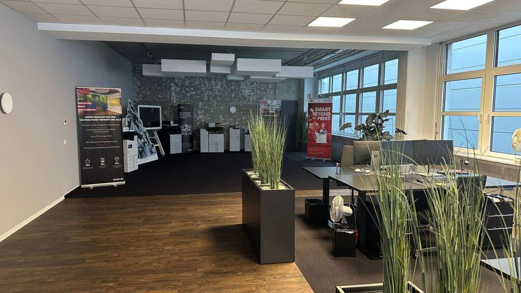 Die modernen Büro-/Ausstellungsflächen sind mit abgehängten Decken, Fensterbankkabelkanälen und teilweise mit Designbodenbelag ausgestattet. Sie sind zur Zeit als Großraum gehalten.