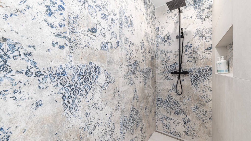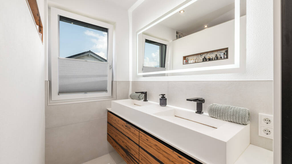 Auch in den Nassräumen wurde Wert auf Qualität gelegt: Fliesenböden und eine fugenlose Duschwand aus einer ganzen Platte unterstreichen den modernen Charakter.