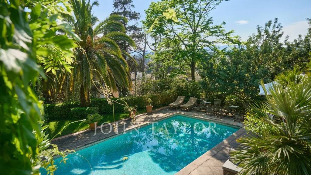 Dans un quartier résidentiel de Cannes très recherché, cette demeure datant de 1850 offre une magnifique vue sur la mer et l'Estérel et une belle hauteur sous plafond.