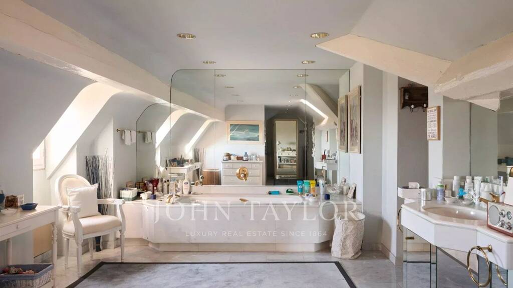 - Chambre de maître avec cheminée donnant sur balcon avec vue mer, dressing et salle de bains avec toilettes.