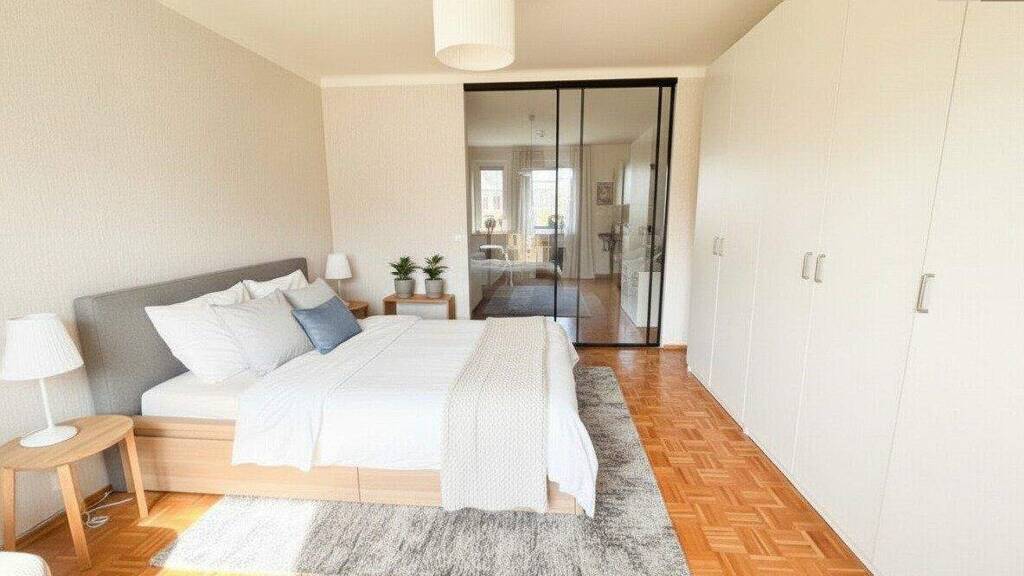 Das Wohnzimmer bietet Platz für eine gemütliche Couch, eine moderne Fernsehwand und einen geräumigen Schrank zur Aufbewahrung. Direkt angrenzend befindet sich das Schlafzimmer.