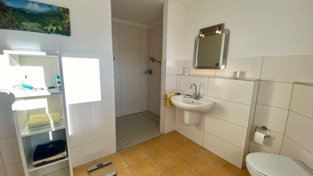 Das Erdgeschoss bietet barrierefreies Wohnen mit breitem Flur und breiten Türen. Neben einem geräumigen Schlafzimmer befindet sich hier ein großes Tageslichtbad mit rollstuhlbefahrbarer Dusche (2qm), eine moderne und funktionale Einbauküche mit Essplatz, Abstellraum und Zugang zur Südterrasse. Das großzügige, helle Wohn-/ Esszimmer bietet zwei Zugänge zu den Terrassen und einen Kaminofen für gemütliche Stunden.