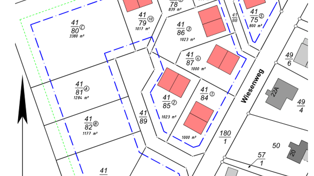 Es entsteht ein neues Baugebiet angrenzend an die Straße „Wiesenweg“. Insgesamt entstehen hier 11 Grundstücke mit einer Größe von 800m² bis 1.096m². Aktuell können die Grundstücke mit einem Einfamilienhaus bebaut werden, die Grundstücke mit min. 1.000m² können mit einem Doppelhaus bebaut werden. Die Bebauung ist gemäß B-Plan möglich. Die Erschließung erfolgt teilweise über den Wiesenweg sowie die zukünftige Anliegerstraße mit Wendekreis.