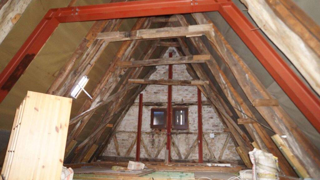 Das Gebäude wurde in Fachwerkbauweise errichtet und verfügt über imposante Balken und Stützen im Innenbereich. Es gibt wenige Wände, die z.T. verändert oder entfernt werden können.