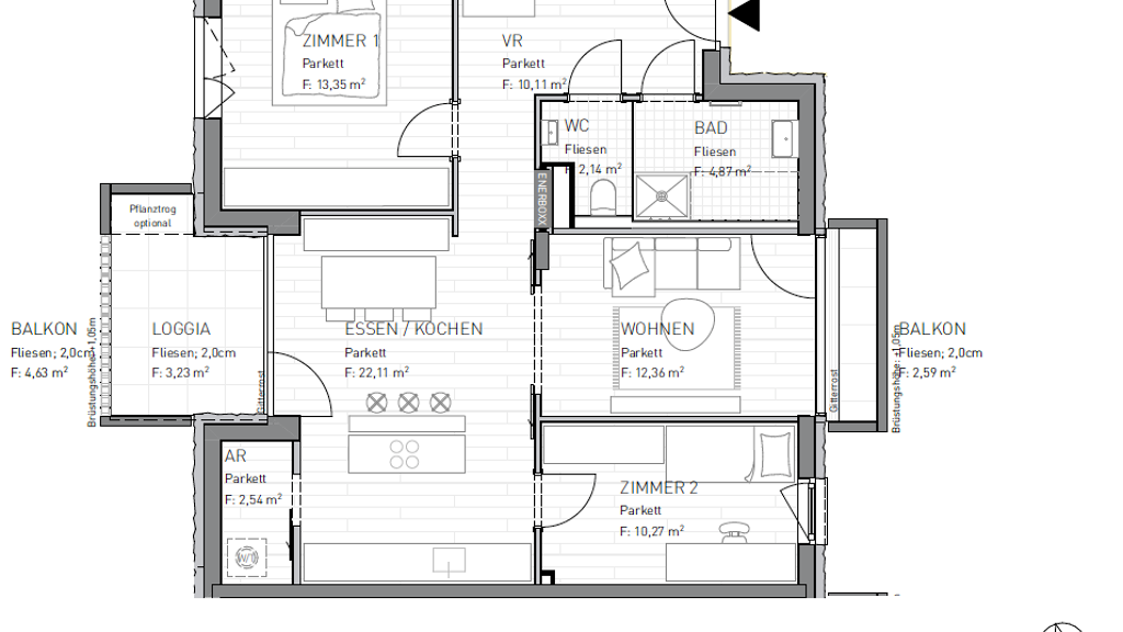 Bei dieser 3 – Zimmer Wohnung wurde jeder Quadratmeter optimal genutzt. Nach dem Eintritt in die Wohnung finden Sie den getrennten Sanitärbereich zu Ihrer Linken. Durch den geräumigen Vorraum gelangen Sie zum 22,11m2 großen Koch- und Essbereich mit direktem Zugang zum ersten Balkon. Weiters finden Sie hier einen Abstellraum. Der 12,36m2 große Wohnbereich hat einen Zugang zum zweiten Balkon, dieser schafft zusätzlichen Freiraum. Zwei Schlafzimmer sorgen für den perfekten Rückzugsort zum Entspannen. Weiters kann ein Tiefgaragenplatz, je nach Größe zwischen 17.900 – 25.000€, oder ein freier Autoabstellplatz um 7.500€ erworben werden.
