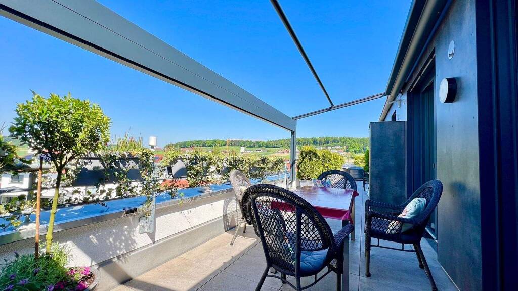 Auf großzügigen 84,58 m² Wohnfläche erwartet Sie ein durchdacht geplanter Grundriss mit lichtdurchfluteten Räumen und modernem Ambiente. Das absolute Highlight ist die beeindruckende, umlaufende Dachterrasse mit 82,87 m², die Ihnen nahezu grenzenlose Möglichkeiten bietet: Sonne genießen, entspannt frühstücken, Gäste empfangen oder einfach den herrlichen Fernblick auf sich wirken lassen. Die elektrische Sonnenmarkise sorgt an heißen Tagen wie auch bei leichtem Regen für angenehmen Schutz und schafft zu jeder Zeit ein behagliches Outdoor-Wohngefühl.