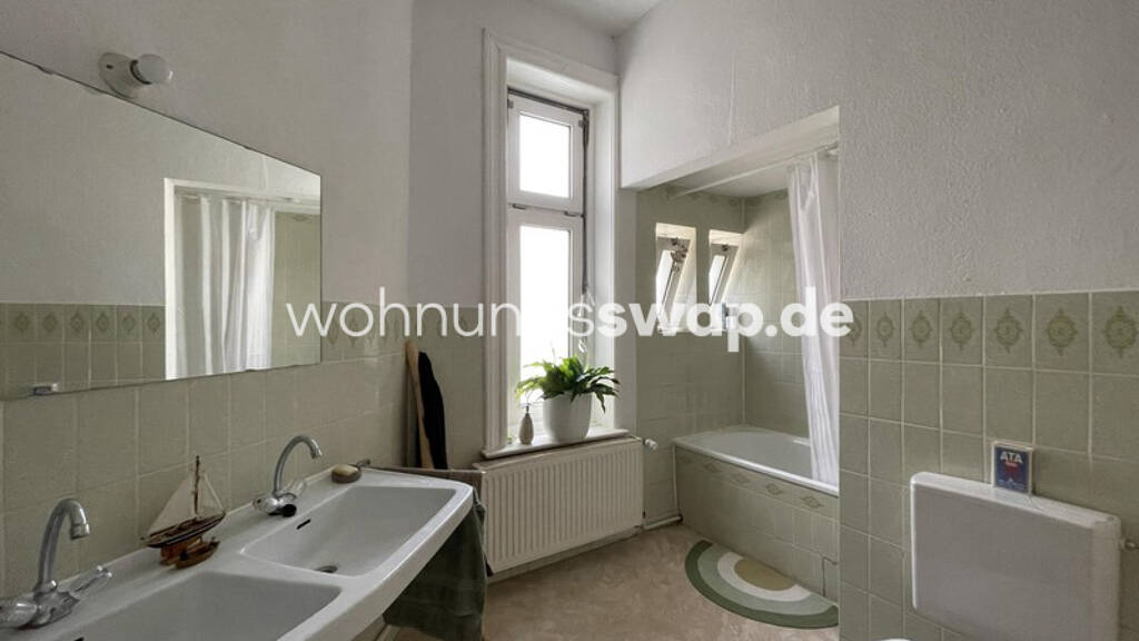 Die Wohnung befindet sich in einem Gründerzeiteinbau, ist sehr hell, hat Holzfußboden und Stuck und schöne alte Türen. Die Küche Und das Bad liegen zum Innenhof, die drei Zimmer zur Straße. Zwei Zimmer sind mit einer schönen alten Flügeltür verbunden. Eins ist separat, der Zugang zu allen drei Zimmern erfolgt vom Flur, man könnte die Flügeltürer also auch schließen. Es ist kein Durchgangszimmer. Das Bad ist das absolute Highlight der Wohnung sehr groß mit einer Nische für Badewanne, Zwei Waschbecken und genügend Platz für Schränke Waschmaschine etc. Es gibt einen Abstellkammer und einen beruhigen, Dachboden, sowie sehr nette Nachbarn, viele Familien mit Kindern. Warmmiete, etwa 950 €