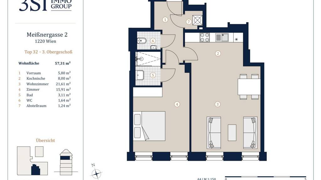 Dieser traumhafte 2-Zimmer Erstbezug verfügt über knapp 58 m² Wohnfläche im 3. Liftstock eines generalsanierten Hauses. Die Wohnung besticht durch ihren durchdachten und geräumigen Grundriss und teilt sich wie folgt auf: