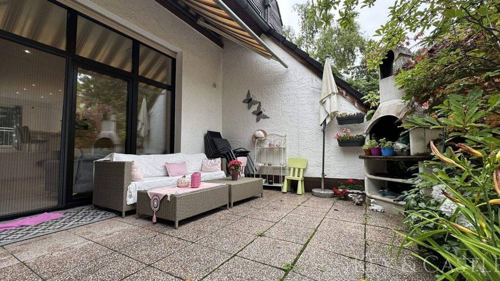 Vom Wohnzimmer aus gelangt man auf die Terrasse und in den gepflegten Garten mit eigenem Brunnen zur Bewässerung.