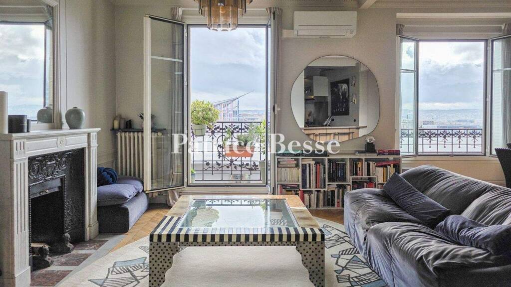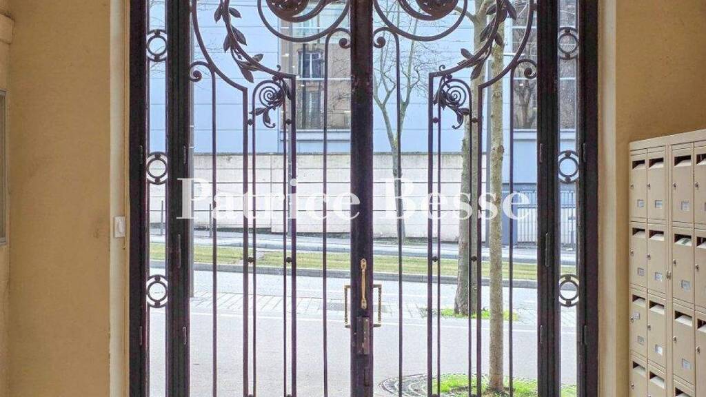 The edifice was designed in 1913 by the architect Gaston Bouzy. It has a facade of dressed stone with rustic-themed decor: a cartouche at the entrance, guardrails sculpted with garlands of foliage and anemones, and corbels embellished with peonies. A glazed double door with wrought-iron arabesques, fitted with an entry code for security, leads into a hallway ornamented with bas-reliefs and a mosaic. Another glazed door, fitted with an intercom for security, leads to a stairwell and a lift that take you up to the different floors and down to the cellar. The apartment offers a 90m² floor area and has a 2.8-metre ceiling height. Its interior was created by an interior design firm. Fitted with air conditioning, it lies up on the sixth floor and faces south-west. The entrance hall leads into a reception room with a floor area of over 30m². This vast space has large windows and is embellished with mouldings, cornices of modillions and a Louis XVI style fireplace made of Carrara marble beneath a trumeau panel of finely sculpted flowers. The kitchen has a pantry on the court side. This kitchen, fitted with a range cooker, combines polished concrete with stainless-steel work surfaces and hazel-wood furniture. Groups of four people can enjoy meals together on a counter here. A corridor with a hidden utility room connects to two bedrooms, which share an 8m² balcony. The first bedroom has a 13m² floor area, a Louis XVI style fireplace and a wall full of cupboards that hide two fold-away single beds. The second bedroom has a 17m² floor area, a walk-in wardrobe and storage spaces with similar floor areas. A glazed wall reveals an adjoining 6m² bathroom. Its polished concrete and iridescent glass-paste tiles give the room a warm atmosphere. A raised bath enjoys natural light. There is also a separate lavatory with a wall-hung toilet. The property includes two 6m² cellars in the basement and a small storeroom on the ground floor. The whole dwelling can be sold furnished.