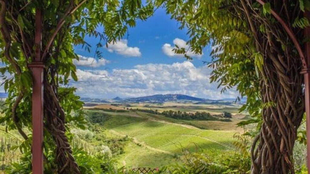 Vom Erdgeschoss, das Küche und Wohnzimmer überblickt und durch zwei Bogentüren erreichbar ist, gelangt man in einen Garten mit Steinpflaster (Chiostra). Hier befindet sich eine Loggia mit Tisch und Stühlen, unter der man zu Mittag essen oder verweilen kann. In absoluter Entspannung können Sie auf bequemen Sofas unter einer Pergola, die von einer wunderschönen jahrhundertealten Glyzinie bedeckt ist, die spektakuläre Landschaft voller Weinberge und Hügel bewundern, die sich bis zur wunderschönen Stadt Volterra erstrecken.