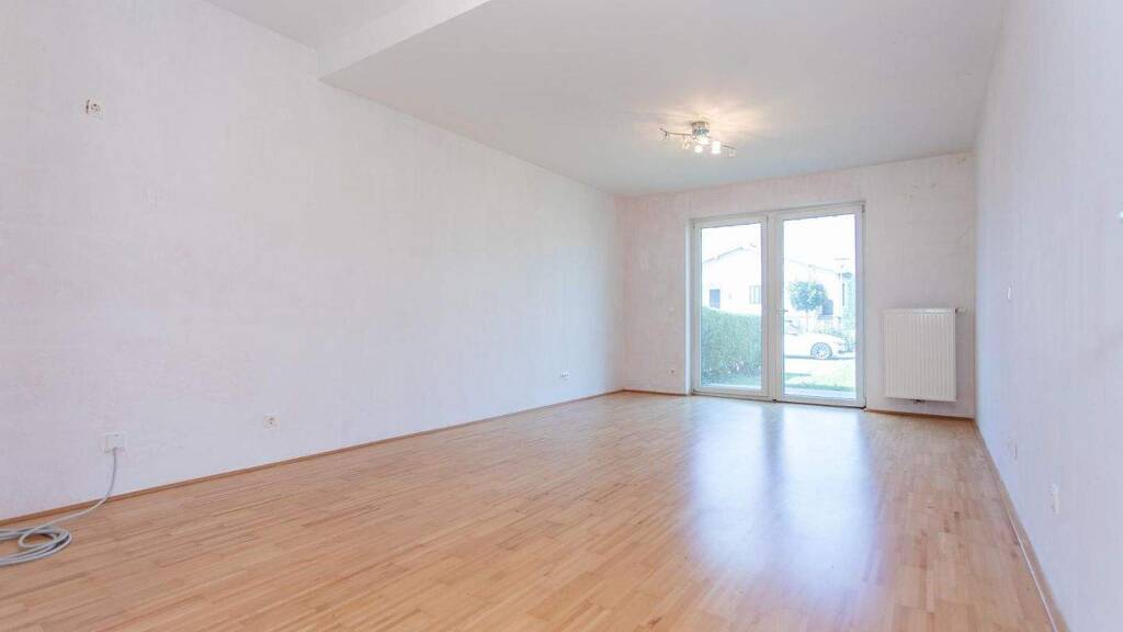 Anschließend gelangen wir in die geräumige Wohn-/Essküche, von wo man direkt auf die Terrasse und in der Garten ca. 55 m² gelangen kann. Weiters gibt es 3 Schlafzimmer und ein Badezimmer mit Dusche.