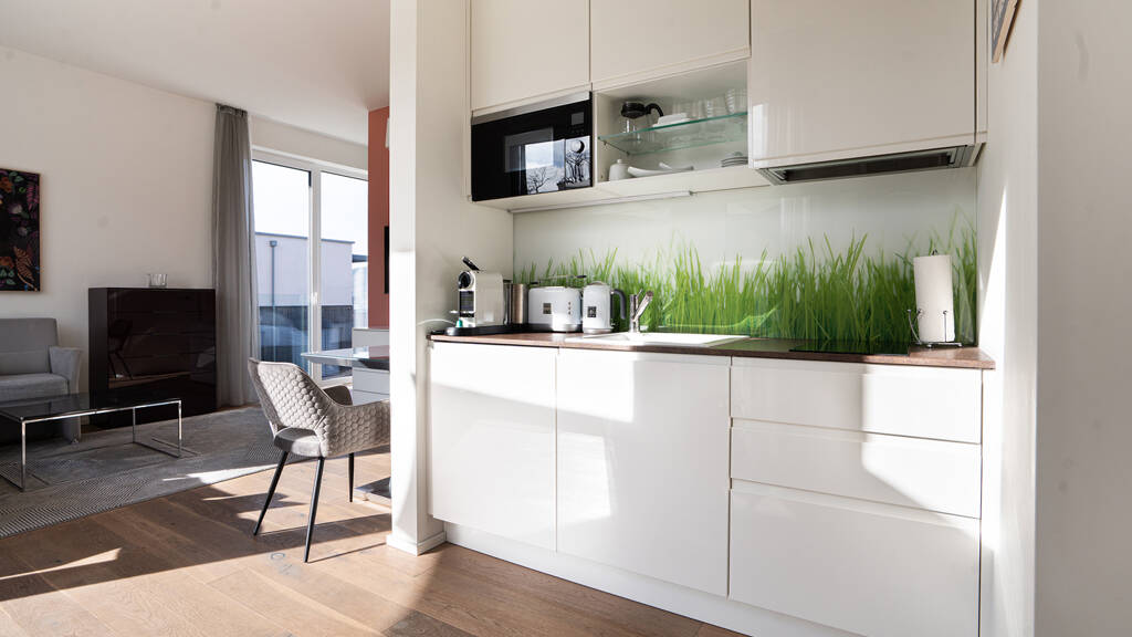 Der großzügige Balkon lädt zum Entspannen mit Blick ins Grüne ein, während Klimaanlage, WLAN und elektrische Sonnenrollos jederzeit für Komfort sorgen. Ein hauseigener Lift bringt Sie direkt aus der Tiefgarage, in der auch Ladestationen für E-Autos und Abstellplätze für Räder zur Verfügung stehen.