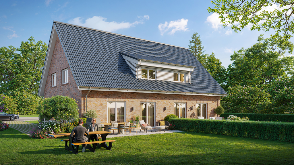 Es handelt sich um ein Neubau-Doppelhaus in Massivbauweise mit klassischem Satteldach, geplant nach den Vorgaben des Gebäudeenergiegesetzes (GEG). Je Wohneinheit erstrecken sich zwei Ebenen mit Wohnen/Essen im Erdgeschoss und drei Schlafräumen im Dachgeschoss; moderne Haustechnik wie Luft-Wasser-Wärmepumpe, kontrollierte Be-/Entlüftung und 3-fach-Verglasung ist vorgesehen.