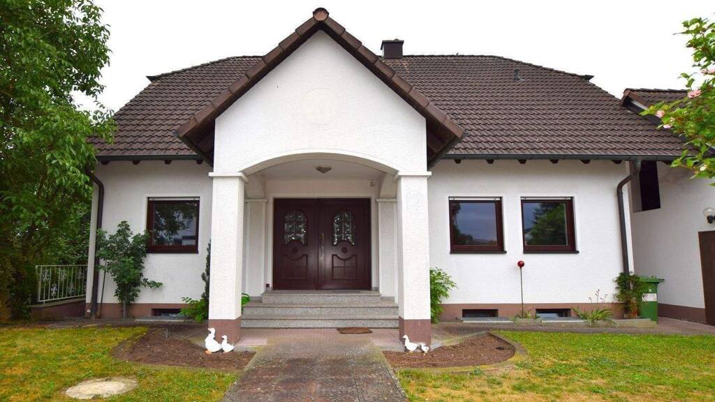 Ein schöner Vorgarten und ein überdachter, stilvoller Eingangsbereich mit Granitstufen empfängt die Bewohner des Hauses. Das Treppenhaus ist aus hochwertigem, hellen Juramarmor gefertigt.