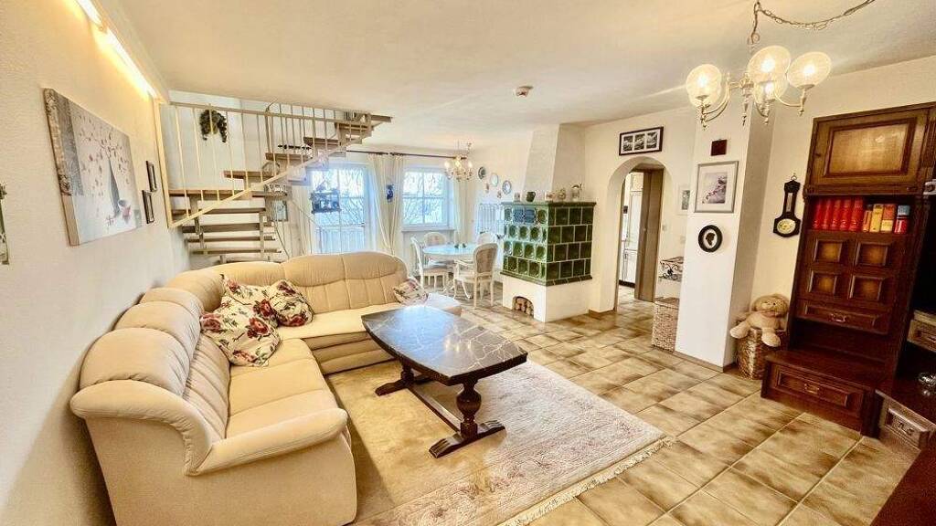 Die untere Ebene beeindruckt mit einem ca. 30 m² großen, lichtdurchfluteten Wohn-Essbereich samt gemütlichem Kaminofen, der für eine behagliche Atmosphäre sorgt. Von hier gelangen Sie direkt auf den überdachten Südwest-Balkon - der perfekte Ort für entspannte Sonnenstunden.