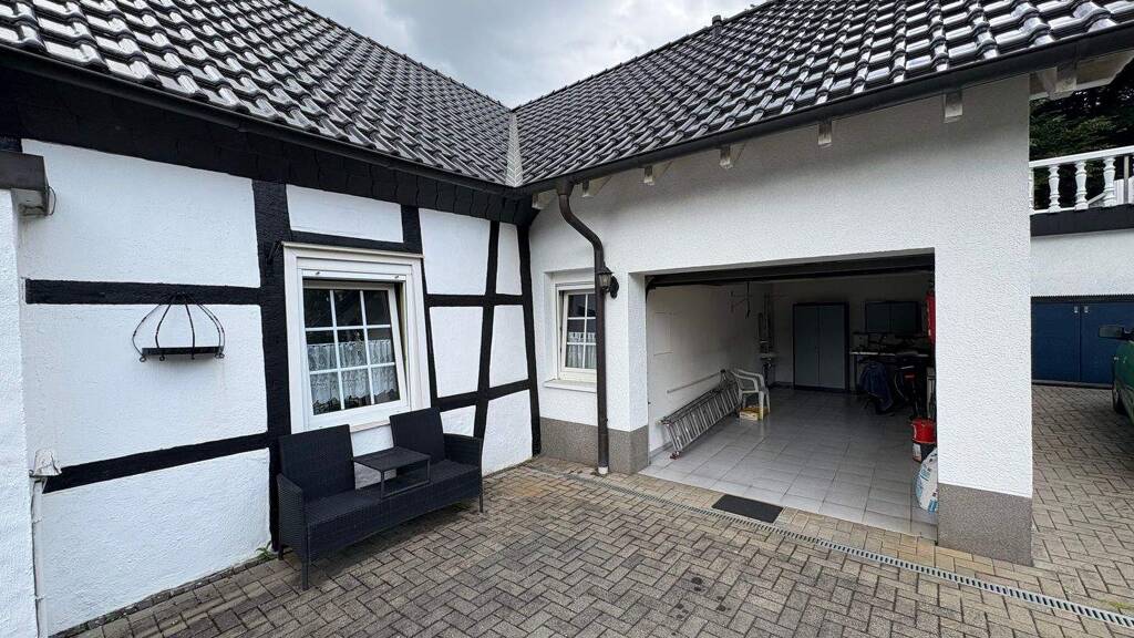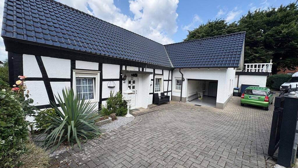 Das Fachwerkhaus mit seinen charakteristischen weißen Wänden und schwarzen Holzbalken strahlt zeitlose Eleganz aus. Der moderne Anbau mit großzügiger Garage und zwei Terrassen ergänzt das Ensemble perfekt und bietet zusätzlichen Wohnkomfort.