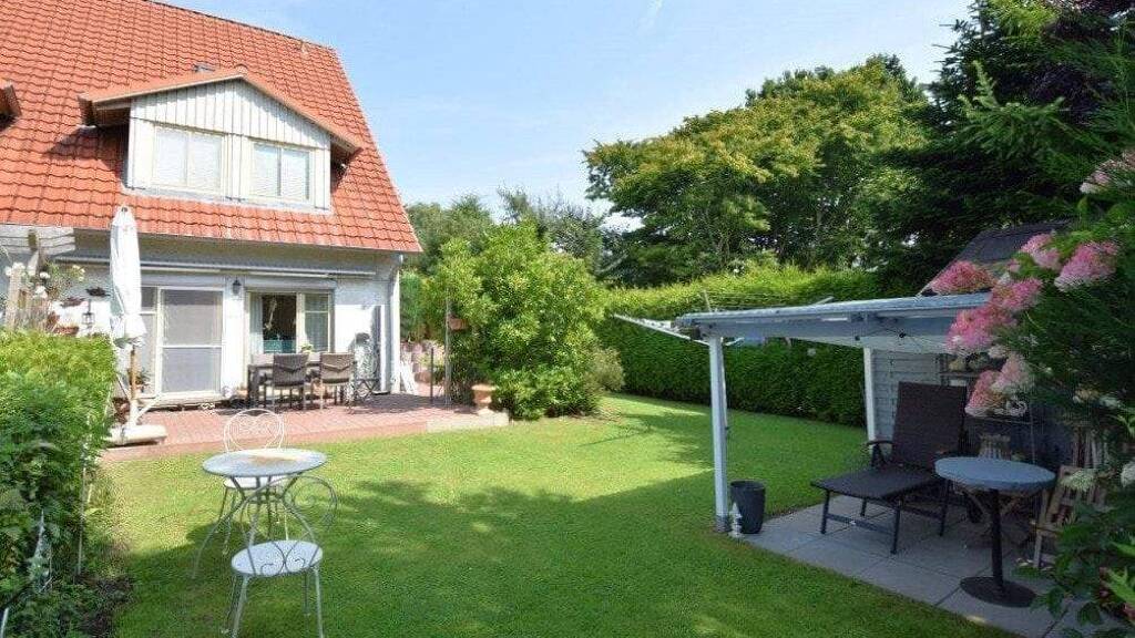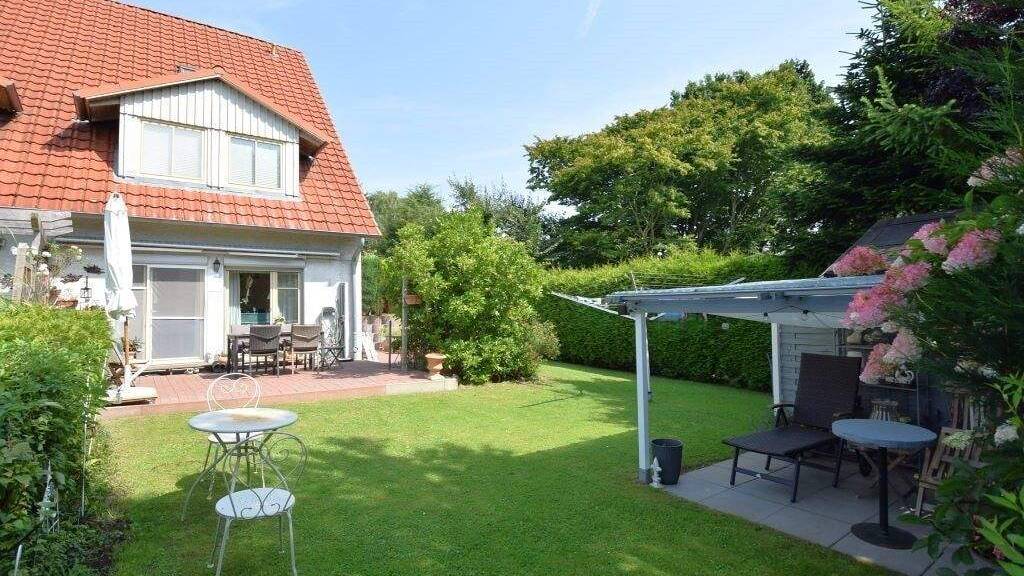 Das Herzstück des Hauses bildet jedoch das Wohnzimmer mit seinem freien Blick über große Fensterflächen in den Garten und die dahinter liegende Natur. Der Parkettboden verleiht ein wohliges und warmes Raumgefühl. Über die Fensterflügeltür gelangen Sie auf die nach Süden ausgerichtete Terrasse und den sehr liebevoll angelegten Garten. Die Terrasse, die mit einer Markise ausgestattet ist, bietet Ihnen viel Platz für schöne Grillpartys. Der gesamte Garten ist durch Zaun und Hecken gut eingefriedet und insgesamt als pflegeleicht einzustufen.