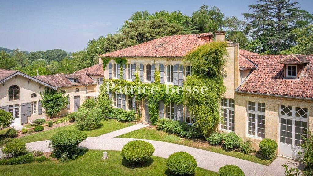 In the Astarac region, a sign bearing the estate's name marks the entrance to the property from a departmental road that winds through hills and countryside. The outlines of the tall cedars of Lebanon stand out, hinting at the presence of a discreet, beautiful residence, sheltered from view by natural hedges, set back from the road. Two tall ashlar pillars frame a delicate 19th century wrought iron gateway. From here, a long bridleway shaded by zelkovas and framed by vast meadows leads to the group of buildings, hidden from each other by dense but skilfully managed vegetation. A barn clad in half-timbering on three sides is revealed below the path, giving way a little further on to a woodshed made of stone and half-timbering. The paved driveway runs alongside the main building, which stands in the centre of a clearing lined with large trees, whose crowns stretch up into the sky. The drive culminates at a huge carport set back from and opposite the house, providing a very welcoming view of the house. The 6 hectares or so of land lies at the intersection of two small roads to the south and west, and a river that runs along the third side of the land, defining the property's boundaries. The main building wing is set back at right-angles and this façade is shady. It overlooks the land to the west, protecting the building from any visual or noise disturbance.