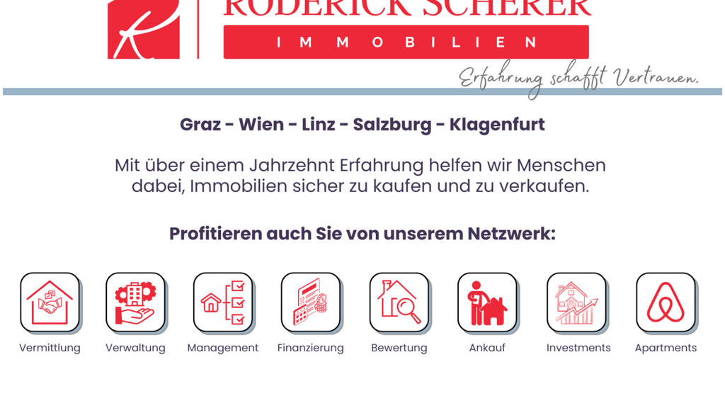 Kein Expose kann den positiven ersten Eindruck vor Ort ersetzen! Vereinbaren Sie am besten jetzt Ihren persönlichen Besichtigungstermin vor Ort unter +43 676 36 46 890 [tel:+436763646890]. Ich freue mich auf Ihren Anruf, Nina Antley, Roderick Scherer Immobilien GmbH.