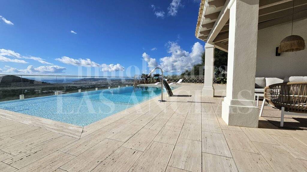 Bei der Renovierung der Villa, deren Grundriss sich durch Großzügigkeit auszeichnet, wurde ein zeitgemäßer und eleganter Stil mit hellen Farbtönen für den Innenbereich gewählt, der perfekt harmoniert mit dem authentisch mediterranen Flair der Außenanlage, deren Fassaden größtenteils mit erstklassigem Naturstein verkleidet wurden. Großflächige Glaselemente garantieren eine direkte Sichtlinie auf das Meer und laden auf die Terrasse im Freien ein.