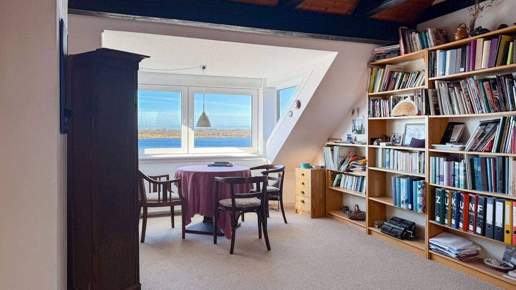 Ein besonderes Highlight stellt die Gaube im Dachgeschoss dar: Sie schafft einen lichtdurchfluteten Raum mit direktem Schleiblick, der sich hervorragend als Home-Office oder Arbeitszimmer eignet. Zur Immobilie gehören zudem eine Garage sowie ein zusätzlicher Stellplatz. Der pflegeleichte Garten ist nach Süden ausgerichtet und bietet ideale Voraussetzungen für entspannte Stunden im Freien – sei es für spielende Kinder, gemütliche Grillabende oder ruhige Momente mit Blick ins Grüne.
