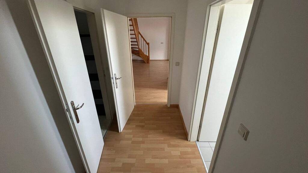Ein echtes Highlight der Wohnung ist die großzügige Innentreppe, die beide Ebenen miteinander verbindet und der Wohnung ein besonderes, weitläufiges Raumgefühl verleiht. Die Böden sind mit pflegeleichtem Laminat sowie Fliesen in den Feuchträumen ausgestattet und sorgen für eine solide, alltagstaugliche Grundlage.