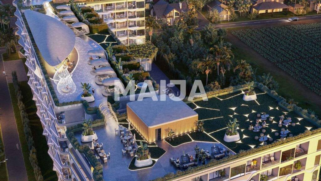 ? Zur Infrastruktur gehören ein großer Pool und ein Kinderbecken, ein Fitnessraum, ein Spa, Coworking, ein Restaurant, ein Minimarkt und ein Parkplatz für 71 Plätze. Das Dach mit tropischer Landschaft bietet malerische Panoramen.