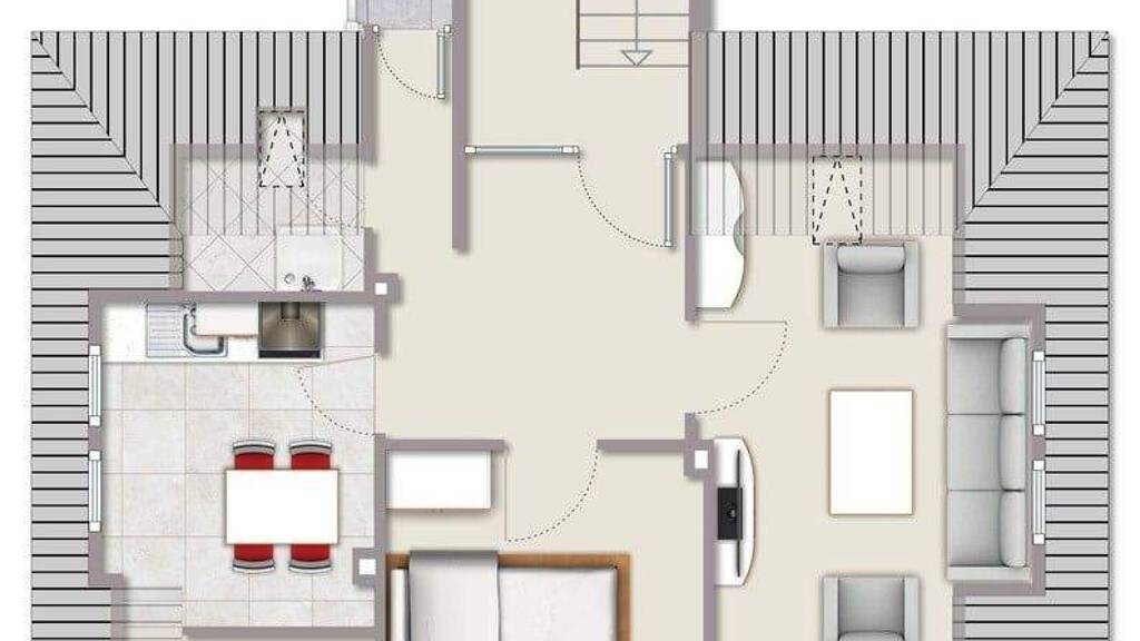 Das ausgebaute Dachgeschoss verfügt eine weitere Einheit mit Wohnzimmer, Wohnküche, Duschbad, kleinem Balkon und Schlafzimmer. Das WC befindet sich auf der Halbetage.