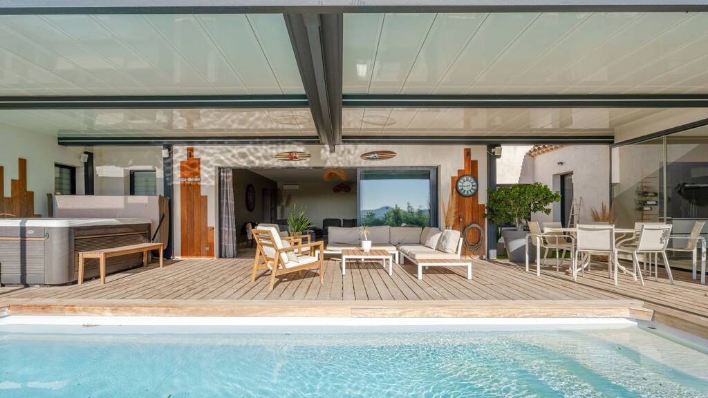 Outside, you can admire the view and its sunsets on a terrace, decorated with a bioclimatic pergola, ideal for enjoying the outdoors in all seasons. A swimming pool and a jacuzzi complete this space dedicated to relaxation and well-being. A private football pitch awaits you, ideal for sharing friendly moments with friends or family.