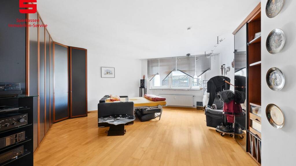 Linker Hand erstreckt sich das großzügige Wohn-/Schlafzimmer mit ca. 27,5 m², das durch seine Größe und Lichtverhältnisse vielfältige Nutzungsmöglichkeiten bietet.