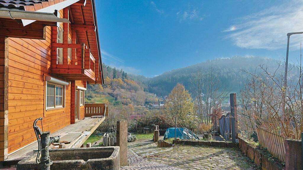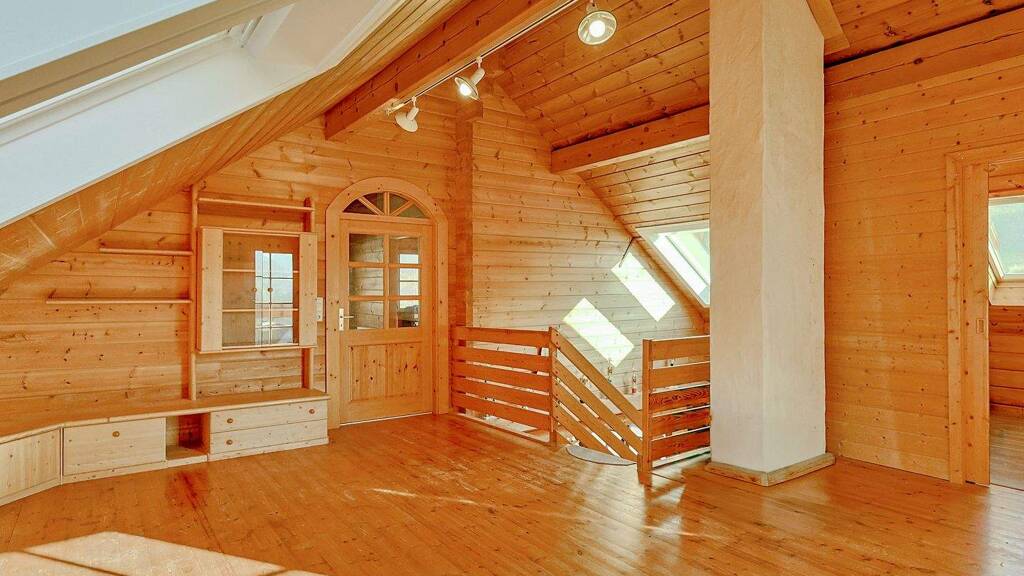 Dieses freistehende Einfamilienhaus in reiner Holzbauweise vereint besonderen Wohnkomfort mit einem außergewöhnlich angenehmen Raumklima. Mit rund 140 m² Wohnfläche, verteilt auf drei Ebenen und insgesamt sieben Zimmer, bietet die Immobilie vielfältige Nutzungsmöglichkeiten für Familien, Paare oder Wohnen und Arbeiten unter einem Dach. Zusätzlich umfasst das Haus eine separate 1-Zimmer-Einliegerwohnung mit etwa 40 m², ausgestattet mit elektrischer Fußbodenheizung. Das Haus wurde im Jahr 1991 auf einem ca. 604 m² großen Grundstück erbaut und 2024 teilweise modernisiert. In diesem Zuge wurden vier neue Dachfenster - zwei davon mit Regensensor - eingebaut. Bereits 2023 wurden alle Dachrinnen erneuert. Ein weiterer Pluspunkt ist der 2017 installierte Ofen im Erdgeschoss. Die Außenfassade wurde ebenfalls größtenteils frisch gestrichen, mit Ausnahme der Rückseite. Die Immobilie befindet sich in absolut idyllischer und ruhiger Aussichtslage. Der traumhafte Panoramablick zählt zu den besonderen Highlights des Hauses und lässt sich von nahezu allen Räumen aus genießen. Das großzügige Grundstück bietet vielfältige Gestaltungsmöglichkeiten im Außenbereich, verfügt über einen eigenen Brunnen sowie einen überdachten Bereich vor dem Haus - ideal für Hobby, Garten oder entspannte Stunden im Freien. Im Erdgeschoss erwartet Sie ein einladender, offen gestalteter Küchen- und Essbereich mit Kamin sowie eine Galerie, die bis ins Dachgeschoss geöffnet ist. Große Sprossenfenster sorgen für helle Räume und verleihen dem Wohnbereich eine besondere Atmosphäre. Von hier aus gelangen Sie zudem auf den großzügigen Balkon. Ein modernisiertes Badezimmer mit Dusche, Badewanne und Doppelwaschbecken sowie zwei schöne Schlaf- oder Arbeitszimmer runden diese Ebene ab. Das Dachgeschoss bietet einen sehr großzügigen Wohnbereich sowie drei gemütliche Schlafzimmer - perfekt für Familie, Gäste oder individuelle Wohnideen. Im Unter- bzw. Gartengeschoss befindet sich die helle 1-Zimmer-Einliegerwohnung mit modernem Duschbad, die sich ideal zur Vermietung, für Gäste oder als Arbeitsbereich eignet.