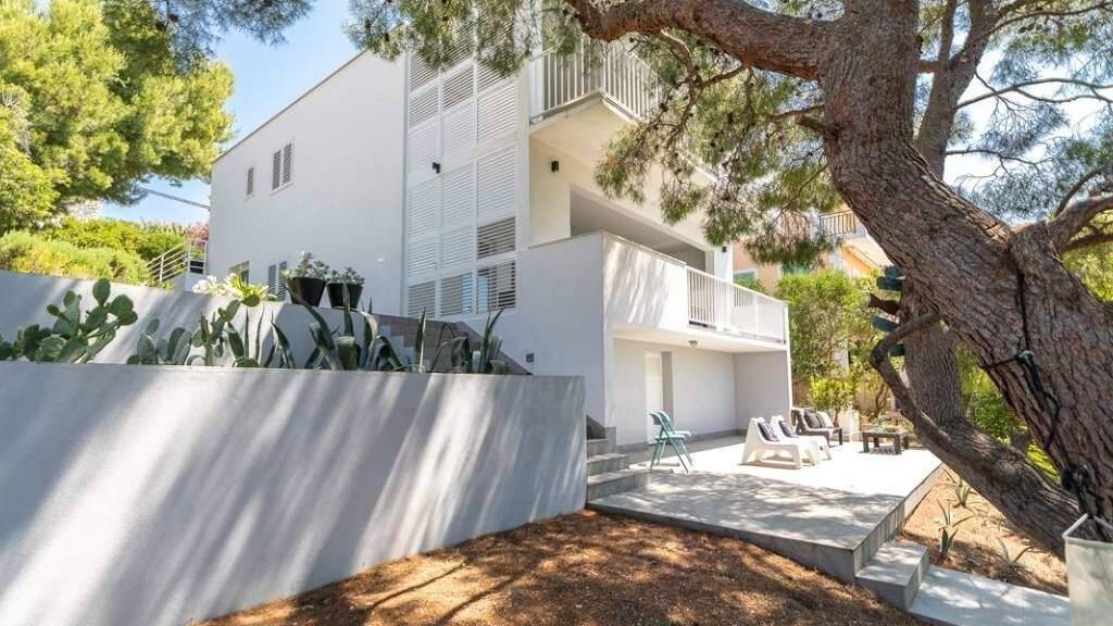 Die Wohnfläche verteilt sich auf drei Einheiten, die dank einer dezenten Innentreppe, die das Erdgeschoss und das Obergeschoss verbindet, entweder unabhängig voneinander oder als Einheit genutzt werden können. Im Hochparterre befindet sich ein Apartment mit einem großzügigen, offenen Wohnbereich mit Küche und Essbereich sowie Zugang zu einer großen überdachten Terrasse ein idealer Ort zum Entspannen und Genießen des Meerblicks. Dieser Bereich verfügt außerdem über zwei Schlafzimmer, ein großes Badezimmer und einen Abstellraum.