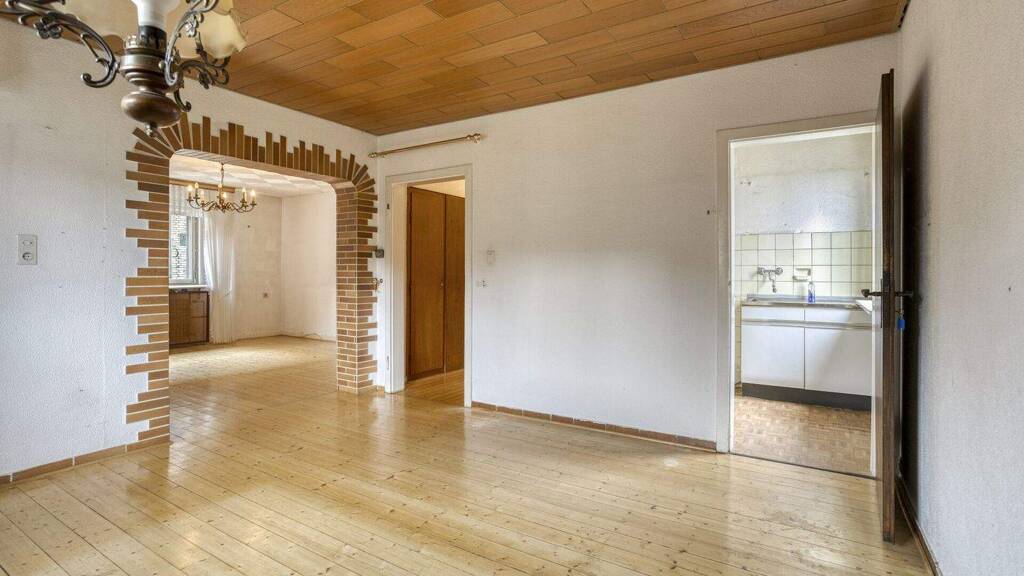 Der Eingangsbereich im Erdgeschoss ist mit einem pflegeleichten Fliesenboden ausgestattet. Im Ess-/ und Wohnbereich erstrecken sich hochwertige Holzdielen, die den Räumen eine warme und einladende Atmosphäre verleihen. Beide Bereiche sind durch einen stilvollen Rundbogen miteinander verbunden.