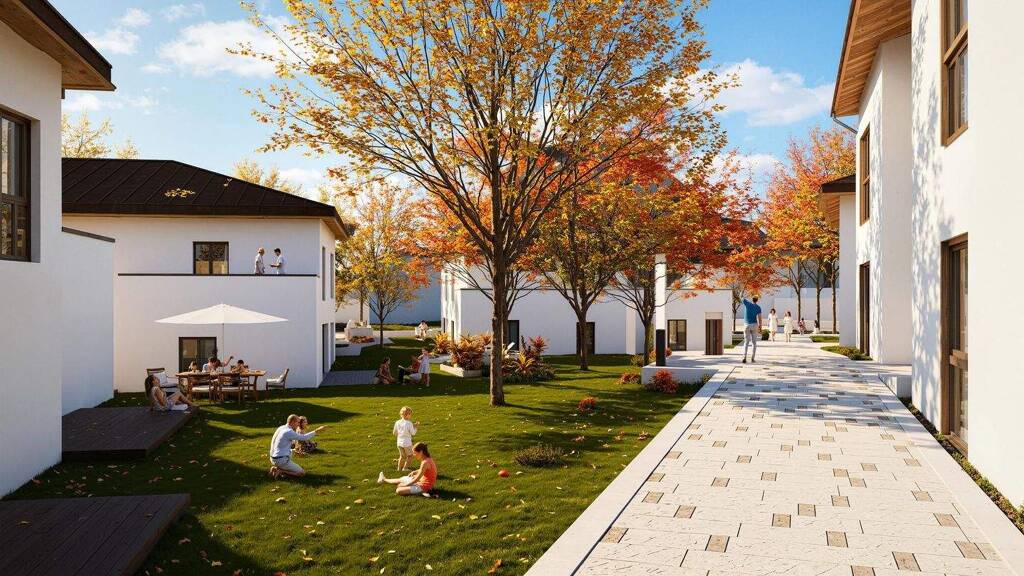 Das Quartier ist offen angeordnet und dennoch klar gegliedert. Eine zentral gelegene Gemeinschaftsfläche mit Ost-West-Verbindung bildet den kommunikativen Mittelpunkt des Ensembles und fördert nachbarschaftlichen Austausch. Durch die gestaffelte Geländeplanung entstehen geschützte Innenbereiche mit klar definierten Außenräumen. Die bewusst reduzierte Flächenversiegelung unterstreicht den nachhaltigen Anspruch der Gesamtplanung.