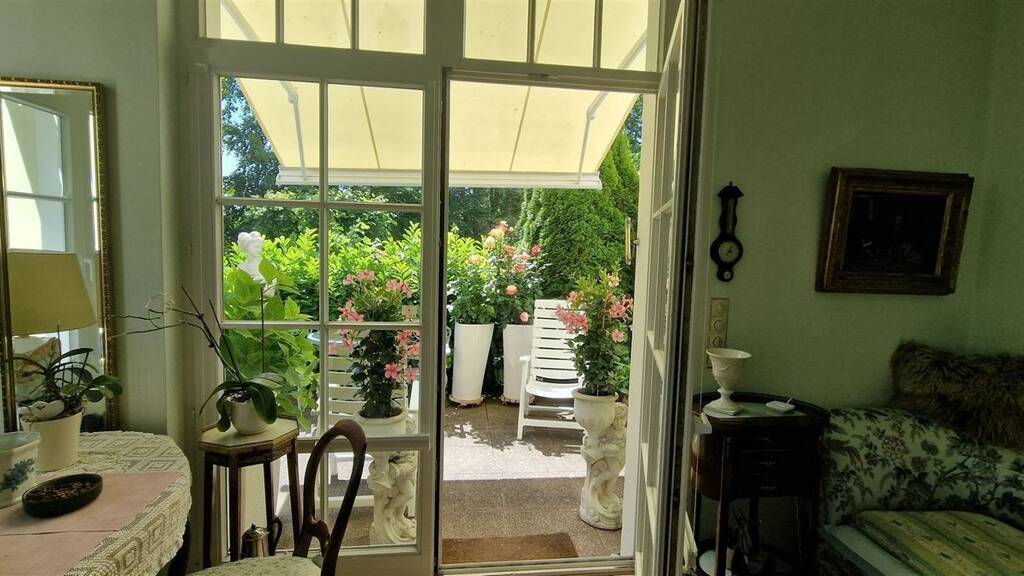 Die verglaste, doppelflügige Schiebetür trennt das Wohnzimmer und den Essbereich, bei Bedarf. Aufgeschoben entfaltet sich die Größe und Luftigkeit des Wohnambientes, das mediterran geprägt ist. Die zart hellgrün gekelchten Wände, der großformatige Natursteinboden und die weißen Akzente der Fensterrahmen, der Stuckleisten etc, wirken wohltuend und beruhigend. Geschickt platzierte Spiegel bilden schöne Sichtachsen und nehmen die Gartenimpressionen auf. Der Blick auf die mit Rosen und blühenden Pflanzen eingerahmten Gartenterrassen wirkt idyllisch und unterstreicht die romantische Atmosphäre. Bei zu starker Sonneneinstrahlung dient die elektrische Markise der Beschattung. Die umlaufende Terrasse ermöglicht es immer einen schattigen Platz zum Relaxen zu finden. Der gemeinschaftlich nutzbare Garten ist parkähnlich, mit großen Rasenflächen und gepflegten Beeten, angelegt.