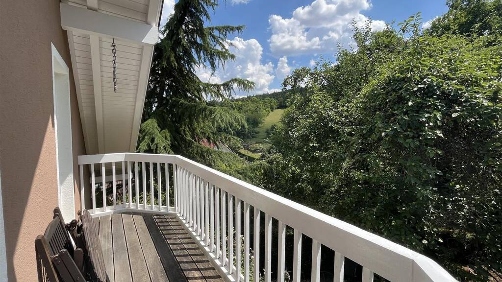 Im Obergeschoss befinden sich zwei großzügige Schlafzimmer, die viel Platz für individuelle Gestaltung bieten. Ein weiteres Badezimmer mit Dusche sorgt für zusätzlichen Komfort. Vom Balkon aus genießen Sie einen herrlichen Blick ins Grüne und die umliegende Natur.