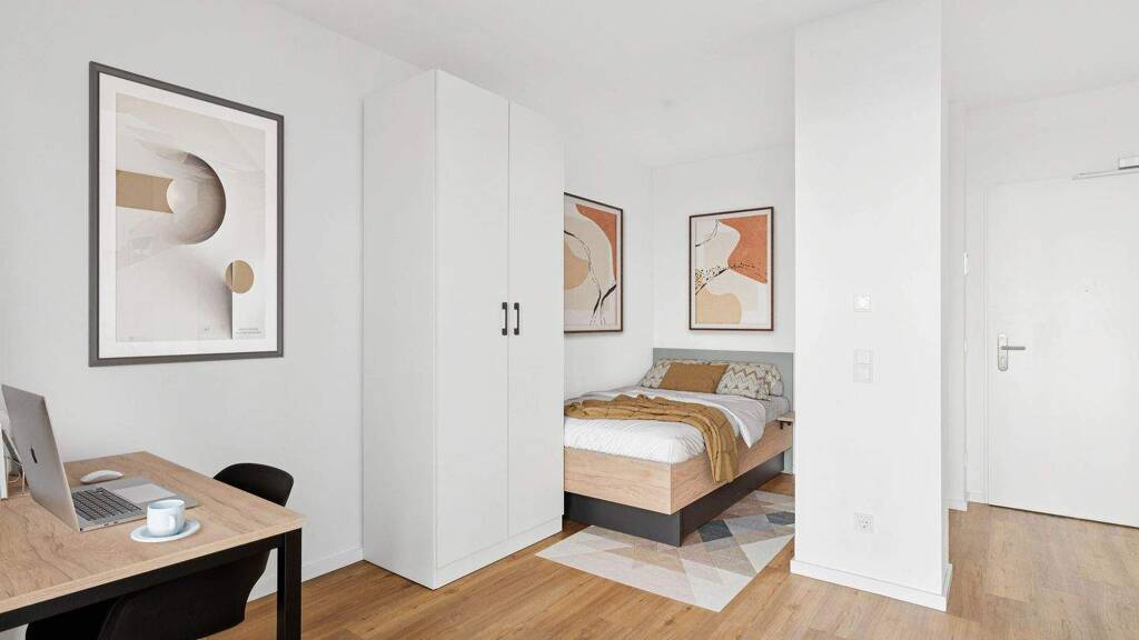 Das Apartment ist voll möbliert - mit allem, was du brauchst: unter anderem Bett, Schreibtisch, Kleiderschrank und Esstisch mit Stühlen.