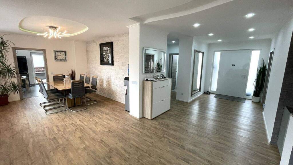 - Aufteilung im EG: ein großer Flur bzw. Eingangsbereich, der direkt in den geräumigen, offenen Wohn-/ Essbereich führt. Von hier gelangt man über das mit schicker Steinwand verkleidete Treppenhaus in das KG (Wohnkeller), auf die große, offene Hauptterrasse und in die Küche, wo sich noch weiterer Zugang zur Terrasse befindet / des Weiteren befinden sich im EG ein großes, helles Eltern-Schlafzimmer / ein moderner Einbauschrank mit Glasschiebetüren / ein gemütliches Arbeitszimmer oder Gästezimmer / ein schickes Gäste-WC und das sehr schöne, moderne Badezimmer mit Dusche & Badewanne