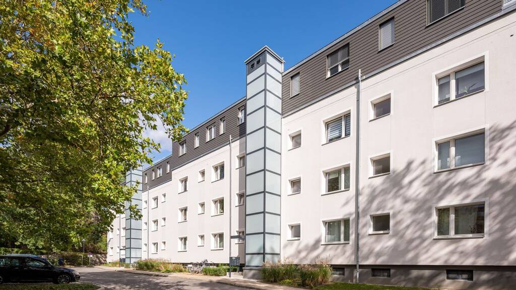 Auf kleinen, gepflasterten Wegen entlang von Bäumen und Blumenbeeten erreicht man die hell verputzten und in moderner Formensprache erbauten Häuser. Die vier Gebäude in diesem Ensemble sind so ausgerichtet, dass sich von den Eigentumswohnungen ein wunderbarer Blick ins Grüne eröffnet. Die im Jahr 2016 und 2017 erbauten Dachgeschoss-Etagen bilden mit ihrem dunklem Anthrazit-Farbton einen modernen, puristischen Kontrasteffekt.